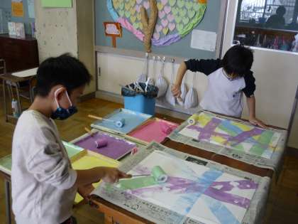 図画工作科では、「ステンシルローラー版画」の製作を始めました。
