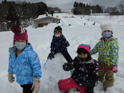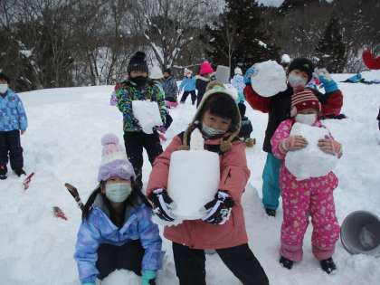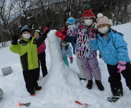 雪像作りでは、ふかふかの雪をたくさん使い、お城や雪だるまなどを作りました。