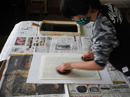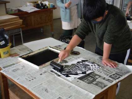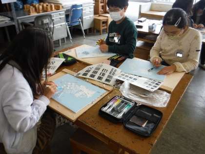 4年生 お気に入りの絵を版画であらわそう! 公開日 2022/02/07 更新日 2022/02/07 第4学年 図画工作科の学習では、版画を行っています。自分のお気に入りの絵を木に写し取り、彫刻刀の刃を使い分けながら、自分のイメージに合うように、彫り進めました。出来上がった土台にインクを付けた後、心をこめながらバレンで刷り上げました。インクが付いたかどうかドキドキしながら紙を持ち上げると、用紙にくっきりと、お気に入りの生き物が写っていたことに満足げな顔をしていました。