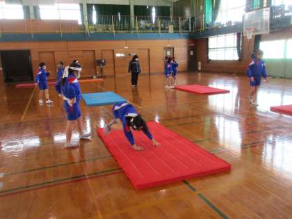 3年生「マット運動!」 公開日 2022/02/08 更新日 2022/02/08 第3学年 3年生は、体育科の学習でマット運動に取り組んでいます。今日は、側方倒立回転の練習に取り組みました。まずは、川跳びや腕立て横跳び越しの練習を繰り返し行い、感覚をつかんでいました。