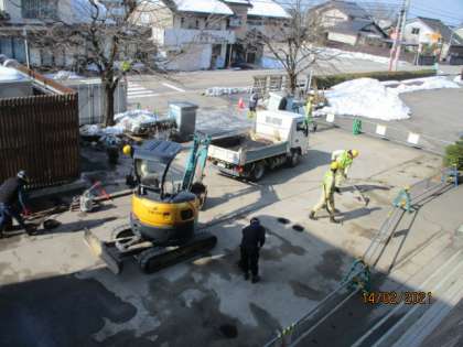 校舎の工事は、竣工間近となり、玄関前の用具の片付けや舗装工事が行われました。この後工事関係の検査があり、来週半ばには正門からの出入りができるようになりますが、新校舎への出入りはもうしばらくの我慢です。