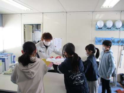 先日、新校舎の工事をしてくださっている方々へ、全校児童を代表して5年生の子供たちがお手紙を渡しにいきまました。手紙には、自分たちが使う校舎を建ててくださっていることへの感謝の気持ちと新校舎への期待が綴られています。