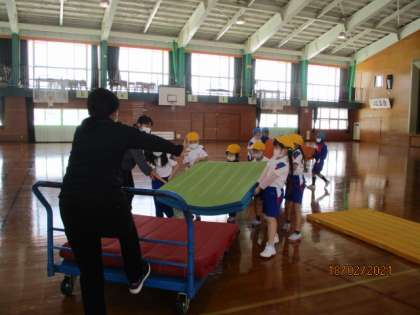 体育館では、1年生がマット運動に取り組んでいました。大きなマットもみんなで協力して片付けられるようになりました。