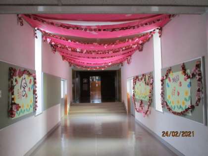学校の中では、来週から始まる卒業を祝う週間に向け、飾り付けが行われています。写真は、体育館へとつながる渡り廊下です。この飾り付けに、6年生の卒業にむけての意識がいっそう高まることと思います。