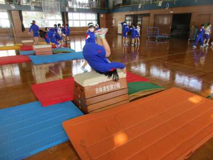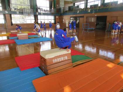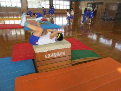 体育科の「跳び箱運動」では、台上前転を練習しています。子供たちは、練習を重ねるうちにコツをつかみ、どんどん上達しています。いろいろな技ができるように、がんばっている3年生です。