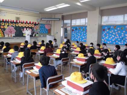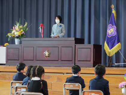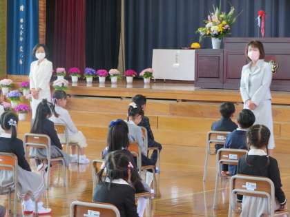 34名の新1年生が、月岡っ子の仲間入りをしました。1年生の子供たちは、校長先生や担任の先生方の顔をじっと見つめ、行儀よく座ってお話を聞いていました。小学生になった喜びとやる気がたくさん感じられる立派な姿でした。