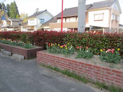 正門の桜が散り、前庭は桜の花びらの絨毯のようになっています。桜に代わって見頃を迎えるのが、花壇に色とりどりに並んでいるチューリップの花です。