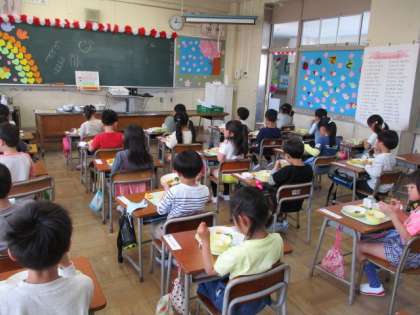 1年生は、本日で給食2日目です。みんな姿勢正しく、そしておしゃべりをしないで食べていました。