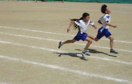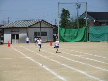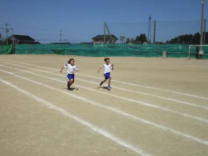 体育科の学習で、50m走をしました。子供たちは、少しでもタイムを縮めようと全力で走っていました。