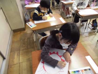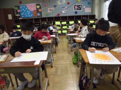 1年生 思いのままに 公開日 2022/04/14 更新日 2022/04/14 第1学年 図画工作の時間、「おひさま にこにこ」という題で、画用紙にお日様を描きました。子供たちは、思い思いに自分のお日様を描きました。どのお日様もにこにことして、素敵な絵に仕上がっていました。