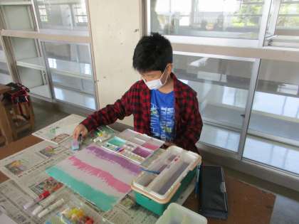 いろいろな材料や用具を使って、表し方を工夫し、自分だけの夢もようを描きました。子供たちは、思い思いの表現を楽しみながら、作品作りに取り組んでいました。