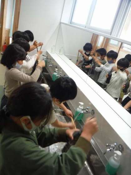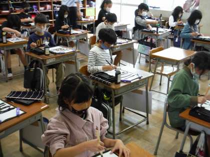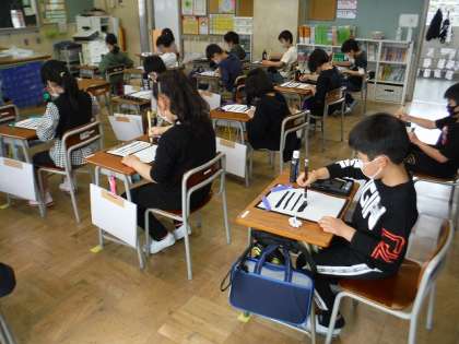 3年生 毛筆を使いました! 公開日 2022/04/23 更新日 2022/04/23 第3学年 3年生の初めての学習の1つとして、毛筆を使った書写が始まりました。硯にすみを入れて、白い半紙に、いざ書き始めました。細い線や太い線など力の入れ具合によって、太さが変わる魔法の筆にびっくりしていました。片付けの仕方もみんなで確認しながら、最後まで無事に取り組むことができました。一筆一筆に思いを込めて、毛筆で書く心地よさを感じていきましょう!