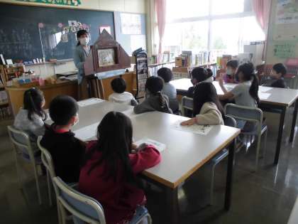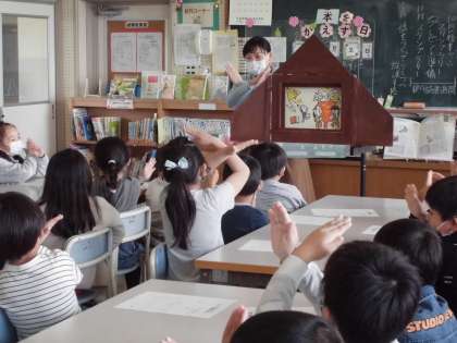 1年生 図書オリエンテーション 公開日 2022/04/23 更新日 2022/04/23 第1学年 初めての「どくしょの森」(図書室)。紙芝居で図書室の使い方や本の取り扱い方を学習し、本を1冊借りました。自分の借りた本を友達と見せ合いながら、楽しく読んでいる1年生。たくさんの本を読んで、心豊かになってほしいと思います。