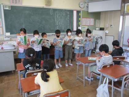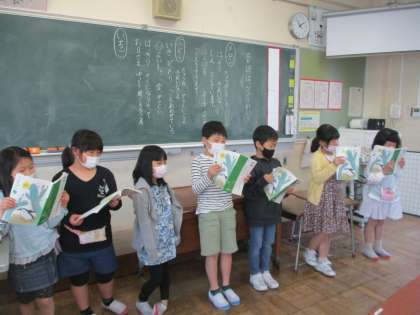 4月28日に、ふきのとうの音読発表会をしました。グループごとに練習を重ね、場面の様子が伝わるように意識して音読をすることができました。それぞれのグループの音読のすてきな所も、しっかりと見付けることができました。