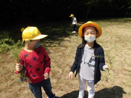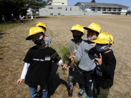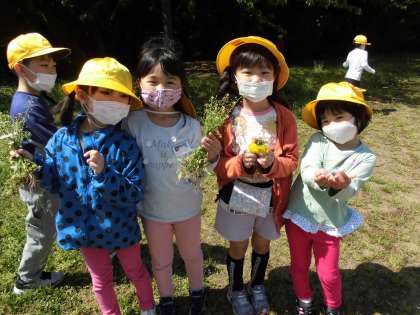 タンポポ、ハルジオン、ナズナ等、たくさんの春を見つけた子供たち。ナズナを使って鈴のように音を出すなど、春を楽しみました。