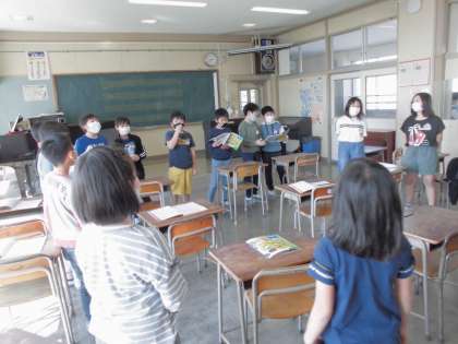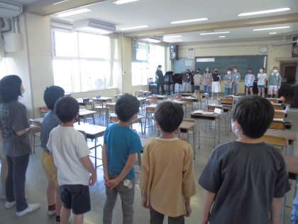 音楽 公開日 2022/05/09 更新日 2022/05/09 第4学年 4年生の音楽では今「花束をあなたに」を歌っています。たくさん練習した後、円になったり向かい合ったりしてみんなで楽しく歌うことができました。