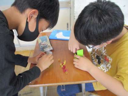 算数の学習では、直方体と立方体を調べています。どちらが大きな入れ物かという課題に対して、入れ物を重ねてみると、どちらを中に入れてもすき間ができました。ですから、ほとんどの子供が同じだけ入るはずだと考えていました。その違いがあるのか、本当に同じ大きさなのかを知るためには、中に何か入れてその数や量を比べれば良いと話し合いました。