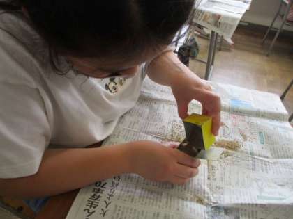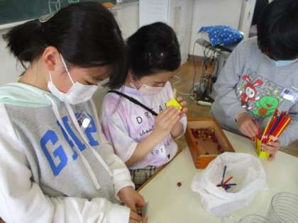そこで、今日は、子供たちから出された案として、砂・小さいブロック・棒などを準備して確かめることにしました。中にいろいろな物を入れていくと、その違いが分かり「先生、こっちの方がたくさん入ったよ!」と砂の量を量っている子供や、「4つ多かった」とブロックの数を数えている子供がおり、自分の考えを確かめる姿が見られました。見た目だけでは、どちらが多く入るかということは分からないことを体感できたようです。