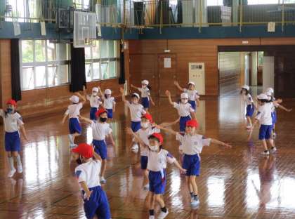 体育では、玉入れのダンスの練習をしています。リズムに合わせて、楽しく踊る姿がみられます。次からは1年生との合同練習が始まるので、お兄さん・お姉さんとしてかっこいい姿が見せられるといいと思います。