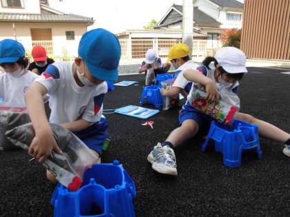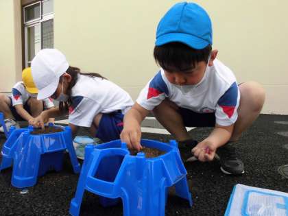 生活科「わたしのあさがお」では、「アサガオとなかよくなろう!」とこれから大切にアサガオを育てていきます。今日は、種を植えました。丁寧に鉢に土を入れたり、種を植えて肥料を与えたりしました。