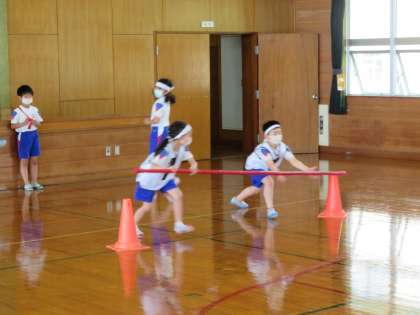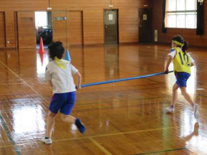 今日、3・4年生の団体競技である「ビッグタイフーン」の練習を初めて行いました。最初は悪戦苦闘していましたが、楽しみながら練習に取り組んでいくうちに、少しずつ上達していきました。本番が楽しみです。