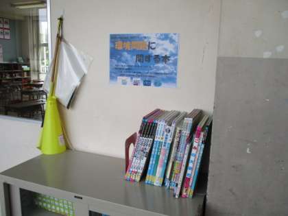 4年生教室前には、総合の学習のテーマとなっている環境に関する本や理科の学習「動物の体のつくりと運動」に関連した本が並べてあります。体の動きの学習とあって、運動会とも関連を図っています。