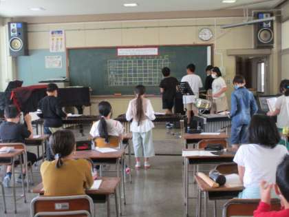 音楽室では、5年生が「リボンのおどり」という曲の合奏に取り組んでいます。楽器の組み合わせによって変わる曲想を感じ取っていました。