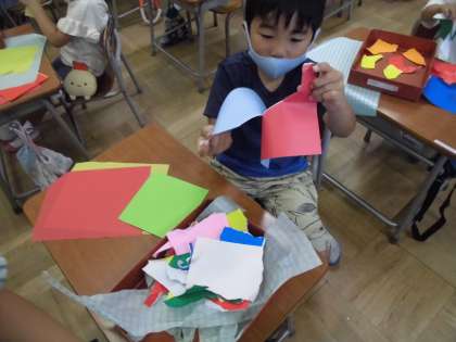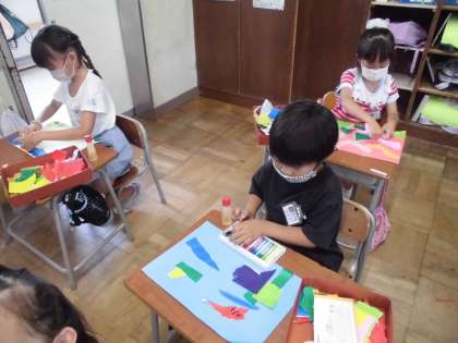 1年生 やぶいたかたちから 公開日 2022/06/23 更新日 2022/06/23 第1学年 図画工作科「やぶいた かたちから うまれたよ」の学習では、紙を破り、じっと眺め、そこから見えてきたものを形にしていきました。 厚紙、折り紙、花紙等さまざまな厚さの紙を思いのままに破いたりちぎったりしました。その形が魚に見えたり、組み合わせてライオンに見立てたりと、楽しい世界が作られました。