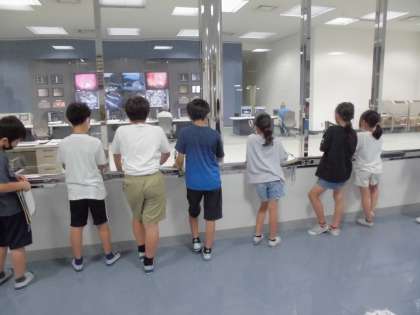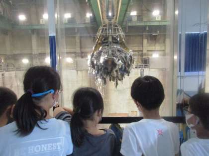 午後からは、富山地区広域圏クリーンセンターに見学に行きました。可燃ごみがごみ収集車で運ばれ、ごみピットにためられていく様子や、大きなクレーンでごみを混ぜ合わせている様子を見ました。子供たちは、「こんなにたくさんのごみがある」「クレーンの大きさがすごい!」と驚きながら、興味をもって見学していました。
