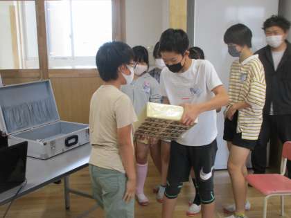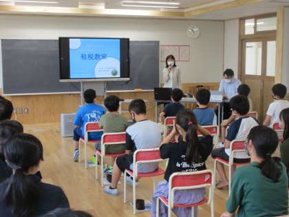 租税教室が行われ、税理士の方から税金のしくみや使われ方等について詳しく教えてもらいました。みんな真剣に話を聞きながらくらしを支える税金の大切さを感じていたようです。最後には、月岡小学校6年生全員の2年間分の教育を支えてくれた税金(約1億円)の重さを体感しました。