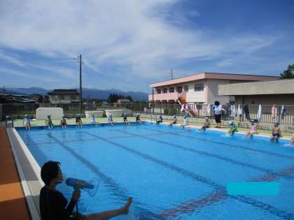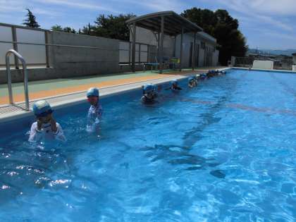 入学して初めてのプールです。いろいろな決まりを知りながら、水に慣れる時間でした。水中に顔を付けてみたり、プールの縁を歩いたりしました。暑い中だったので、とても楽しんだ1年生です。