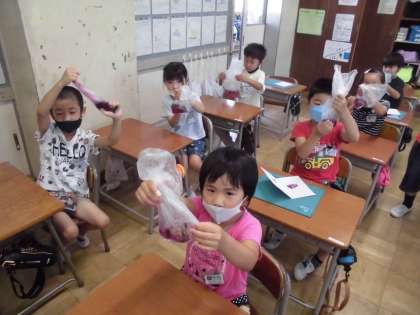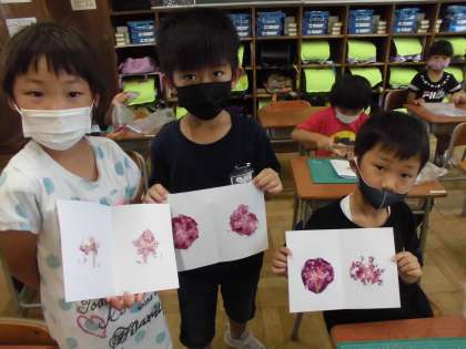 1年生 アサガオの花となかよし! 公開日 2022/07/07 更新日 2022/07/07 第1学年 毎日、色とりどりの花を咲かせ、1年生を喜ばせているアサガオ。 花を摘んで遊びました。しぼんだ花を水の中で揉み込み、色水を作りました。花が咲いている子供たちは、画用紙の間に挟んで木槌で叩き、形取りをしました。 夏休みは、家でアサガオのお世話をします。ご家庭でも、ぜひアサガオの花で遊んでみてください!