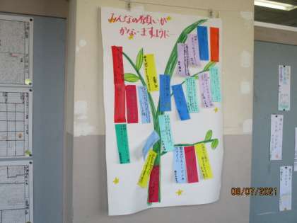 昨日の七夕にちなんで、3年生と5年生では、願い事を短冊に記し掲示してありました。「学習のたしかめで200点がとれますように」「誕生日プレゼントがもらえますように」という子供らしい内容から「ウクライナの戦争が早く終わりますように」など、世界の平和を願うものもありました。そして、多くみられたのは、コロナの収束です。子供たちの願いのとおり、1日も早く、マスクを外して気兼ねなく生活できる日がくることを願うばかりです。
