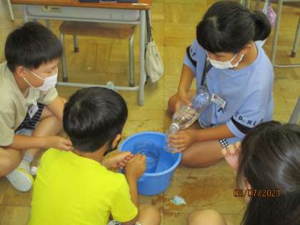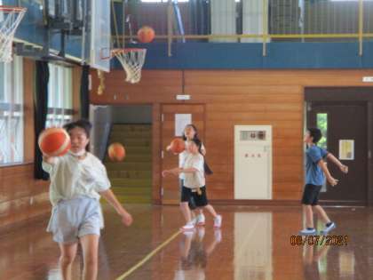 2年生教室では、算数の学習で1リットルデシリットルの関係を実際に水をカップで量って調べていました。暑い日に水を使う活動に楽しく取り組んでいました。一方、体育館では6年生が学級の運動集会でみんなで汗を流していました。