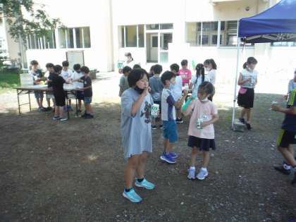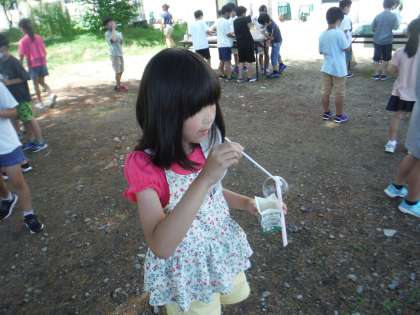子供たちが様々な実験や体験を通して、あれ?不思議だな?どうしてだろう?やってみたい!という気持ちをもたせようと、どきどき実験教室を開いています。今日は、3年生のシャボン玉実験の日でした。なかなか大きくふくらまずに悪戦苦闘していると、他の子供たちから、「息をやさしく入れると、ふくらんだよ」という声を聞いて、みんなもふくらませることができました。実験では、「ストローの太さを変えるとシャボン玉の大きさは変わるのか」「ハンガーやラケットにシャボン液をつけると、どんな形ができるのか」など、子供たちなりに考えた仮説をもとに、いろいろ試す姿が見られました。あっという間に時間が経過し、「もっとやりたかった!」という感想が聞かれました。いろいろなワクワクドキドキが見つかったひとときでした。