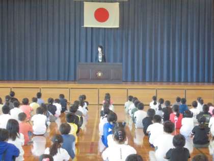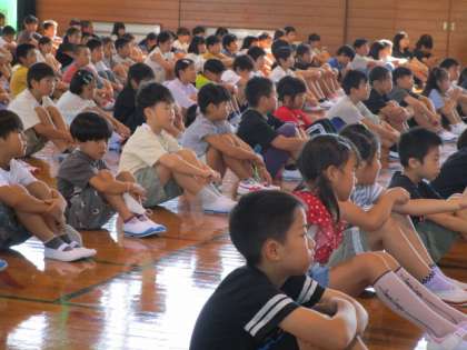 始業式は、感染症対策をして、体育館で行いました。「いろいろな行事のある2学期。1つ1つの行事に『いきいきチャレンジ』でがんまりましょう。」との校長先生の話に、子供たちは、うなずきながら真剣に話を聞き、2学期の決意を新たにしていました。