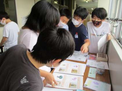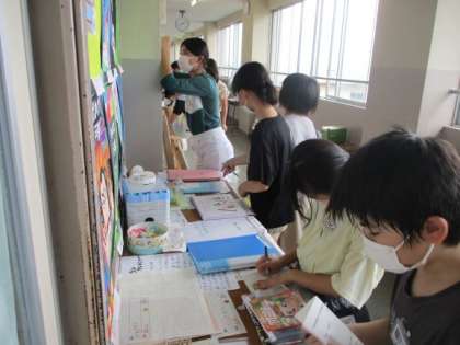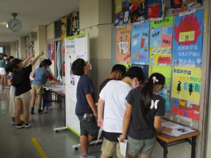 夏休みにがんばった作品を見てまわりました。他学年のがんばりに「すごい」「こんな研究やってみたい」と刺激を受けたようです。特に、6年生の防火ポスターの力作ぞろいに、「来年のためによく見ておこう」と熱心に見ていました。はっきりと分かる色の塗り方やデザインのおもしろさを見つけ、自分に生かそうとしていました。また、他学年からも5年生の作品を見てもらったことで、来年もまたがんばろうという気持ちになったようです。