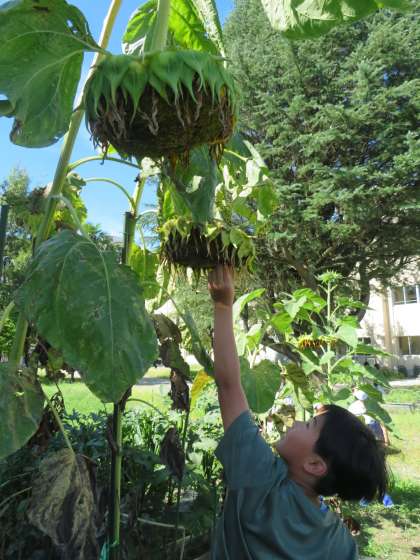理科の学習で、中庭で育てている植物の様子を観察しに行きました。子供たちはきれいに咲いている花や、自分の身長よりも高くなっている植物の様子を見て、植物の成長を感じ、喜んでいる様子でした。