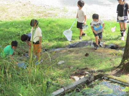 のびのびタイム、体力つくりを終えた低学年の子供たちが、中庭に出てきました。虫かごや虫取り網を手に、生き物探しに余念がない様子でした。