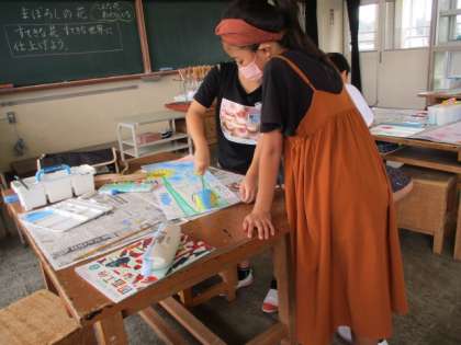 3時間目、図工室では、4年生が「まぼろしの花」の製作に取り組んでいました。「こんな花があったらいいな」という思いを水彩を使って表現していました。