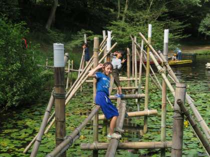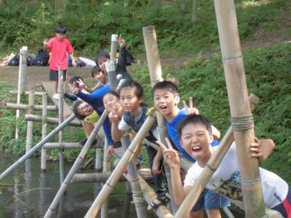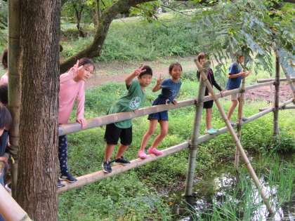 4年生 校外学習「呉羽青少年自然の家」8 公開日 2022/09/15 更新日 2022/09/15 第4学年 池ジャングルの様子です。下が池になっているため、最初は慎重に子供たちは池ジャングルの竹を渡っていましたが、慣れてくると子供たちは何回も繰り返し渡っていて、とても楽しそうでした。