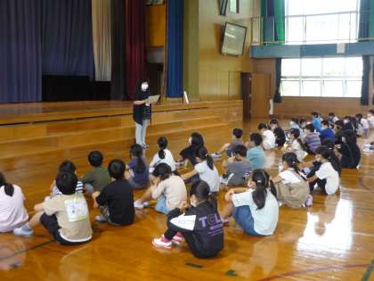 写真上は、連合音楽会の練習の様子です。ステージまでの移動の仕方や歌う隊形についての説明を聞き、実際に動いてみました。
