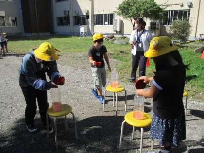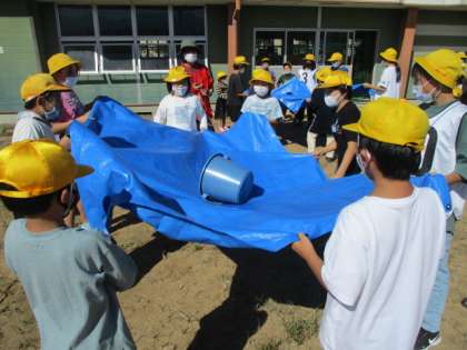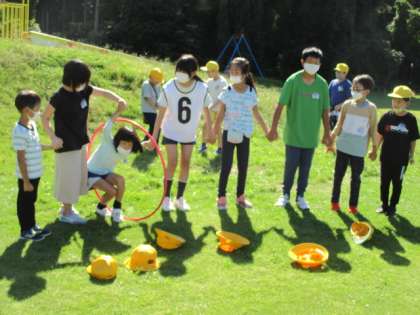 写真は、グラウンドでのミッション「バケッツボール」、中庭でのミッション「満水レース」、壇の山公園でのミッション「フラフープリレー」に取り組んでいるところです。子供たちの笑顔やはつらつとした姿が随所で見られました。そして、班の仲間と交流を深めることができた子供たちもたくさんいます。
