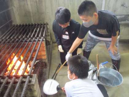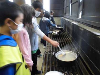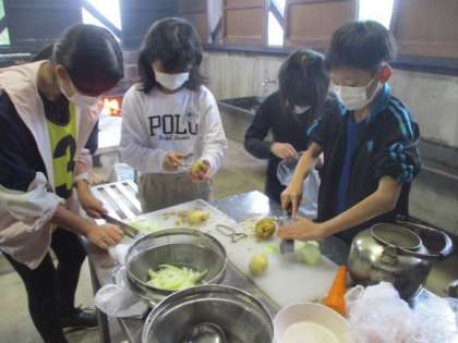 5年生宿泊学習 その4 公開日 2022/10/05 更新日 2022/10/05 第5学年 2日目は野外炊飯。火おこしは初めての体験でしたが、空気が入るようにと上手に薪を組み立てて、火を着けました。おいしいカレーができました。