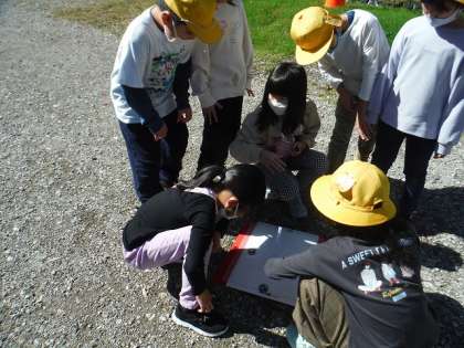理科の学習では、太陽とかげの動き方について学習しています。先日、教室にできたかげに注目すると、何となく位置が変わっていることに気付きました。そこで、かげは動いているのではないかという予想を立て、さらに場所によってかげのでき方は違うのではないかと考えて、グラウンド、中庭、玄関前、教室のベランダの4つに分かれて、観察・記録を行いました。グループごとに休み時間や学習前にそれぞれの場所に行って、調べました。他のグループの観察・記録と比べている子は、かげの動き方に共通点があることに気付いている様子が見られました。自分たちの予想をもとに実験をしている子供たちの表情は、とてもいきいきとしていました。
