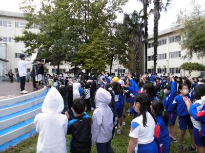 全校の月岡っ子に集まってもらい、中庭のお披露目会をする日でした。今朝まで降った雨で、中庭には水たまりができてしまっており、その整備から始まりました。そして、いよいよ、お披露目会が始まりました。お披露目会が終わる頃には、雨も上がり、月岡っ子も中庭に親しみを感じてくれたようでした。