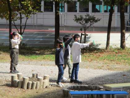 4時間目には、3年生の子供たちが、中庭で理科の学習に取り組んでいました。鏡を使って日光を反射させる活動です。中庭はうまい具合に日向と日陰ができており、日向で鏡に受けた日光を陰となった教室棟校舎の大きな壁面に反射させ、鏡を動かしながらその様子を観察していました。