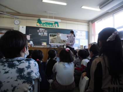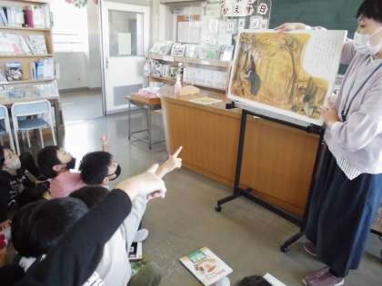 1年生 どくしょの森で 公開日 2022/11/14 更新日 2022/11/14 第1学年 どくしょの森(図書室)で、大型絵本の読み聞かせをしてもらいました。この絵本の挿絵は、隠し絵のようになっていて、1年生が大好きな絵本の1つでもあります。「どこ?」、「ほら、あそこにいる!」と見付けては喜んでいた子供たちです。