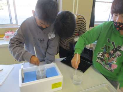 理科の学習では、物のとけ方を学んでいます。前回、ミョウバンと塩の温度による変化を調べ、塩は氷水につけて温度を低くしても、熱いお湯にしてもそれほど溶ける量は分からなかったののに対して、ミョウバンはびっくりするほど温度の影響を受け、10度以下の温度では全く溶けず、逆に温度を上げれば上げるほど溶ける量が増えていました。物によるとけ方の違いを感じました。