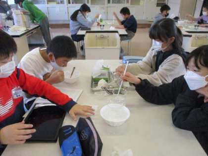 そこで今日は、学校にあるクエン酸やホウ酸、また家から入浴剤を調べたいという子供もおり、実験で確かめました。物によって、溶ける量の違いや、溶ける様子も違っており、夢中になって調べる子供たちでした。